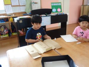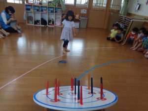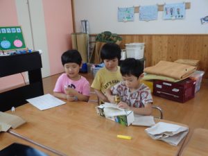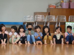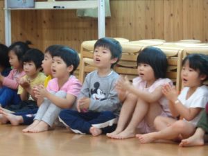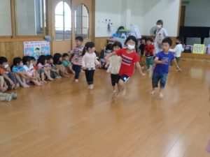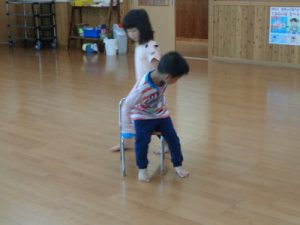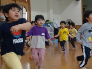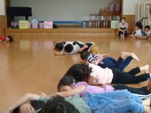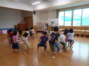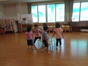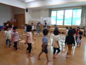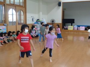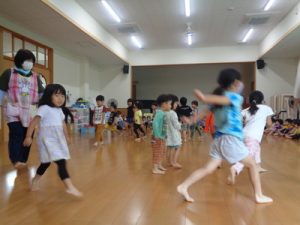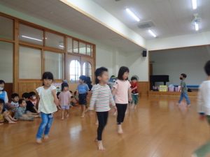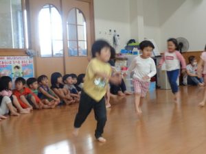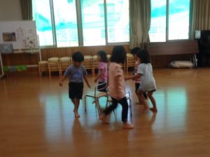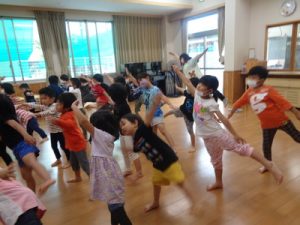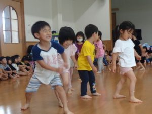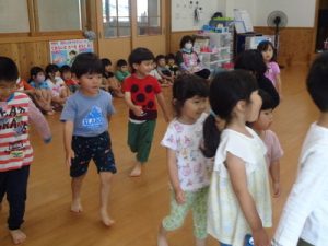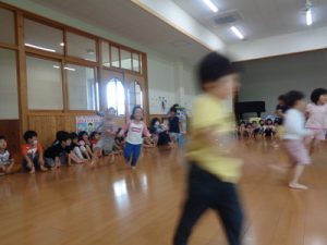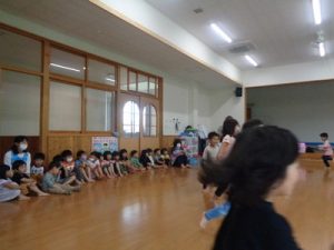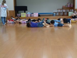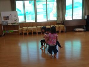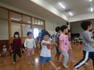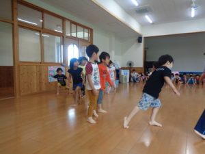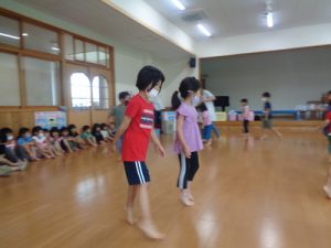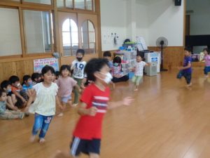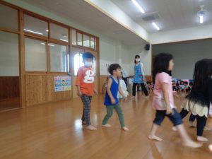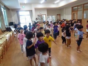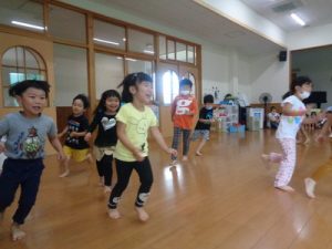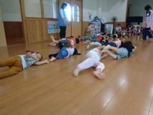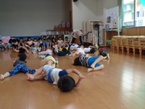 お天気が悪かったので、ランチルームに集まり朝の体操を行い