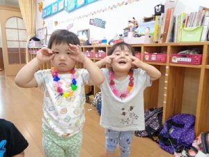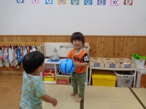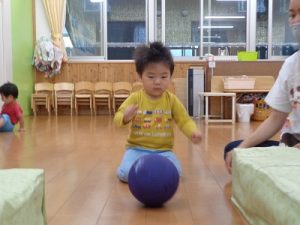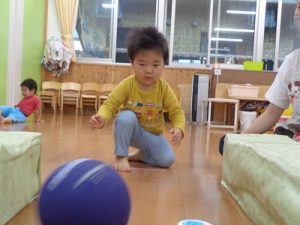 風船遊びでは、みんなで3個の風船を使って遊ぶことに挑戦しました。なかなかみんな遊ぶことが難しく、自分の風船がないと泣き出す子どももいましたが、みんなで使うということを、少しずつ覚えてくれたらと思います。