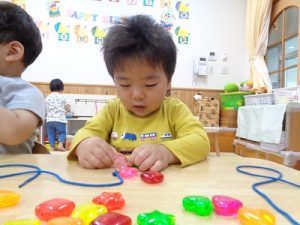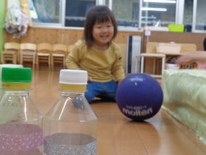 今日は、うさぎ組の部屋で、ボウリング遊び、風船遊び、紐通し、スプーンの持ち方の練習をしました。