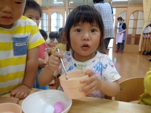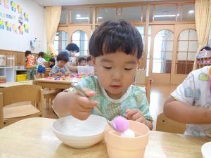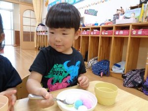 「ふわふわのポンポンの玉」をすくってお皿に移していました。正しい持ち方が出来ていないお友達もいるので、お家でも練習してみてね!