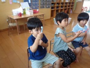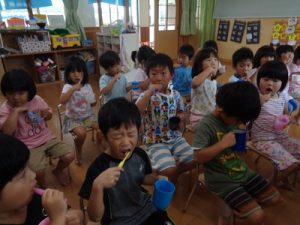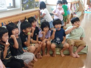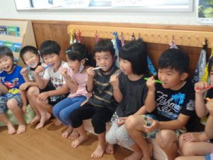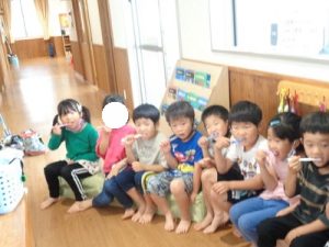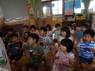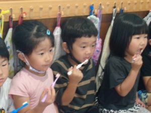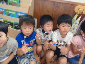 「こんにちは」の磨きで歯の表面、「さよなら」の磨きで裏側を磨く様に指導しました。