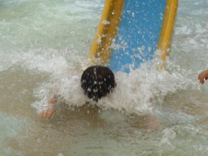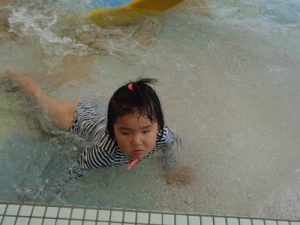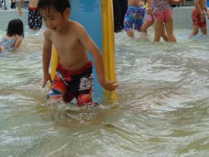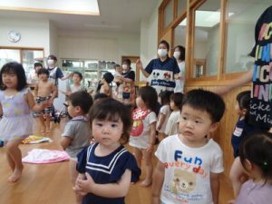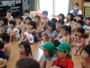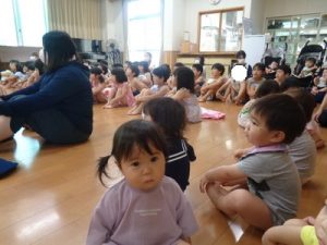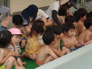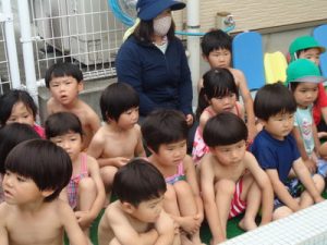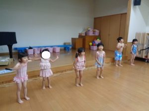 水着に着替え、ランチルームに集まりお約束のお話を聞き準備体操を頑張りました。