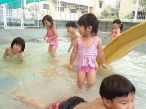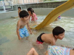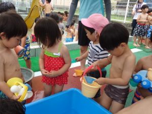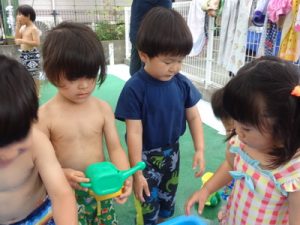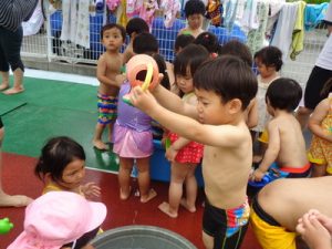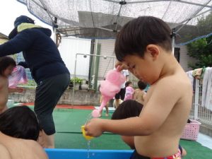 りす組やひよこ組も、各クラスにて水遊びを楽しみました。
