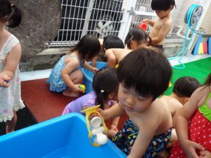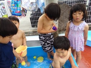 また、うさぎ組は四角のタライのプールで楽しんで遊びました。