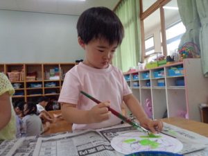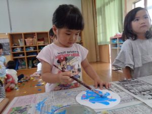 今日は、ぱんだ組になって初めての絵の具遊びを行いました。