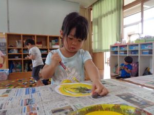 絵の具や筆の使い方のお話をし、熱心に聞いていた子ども達。