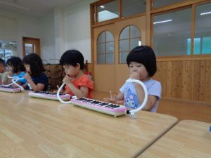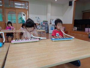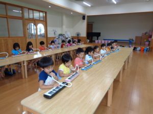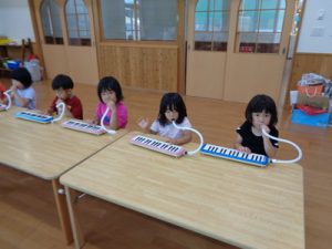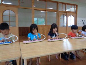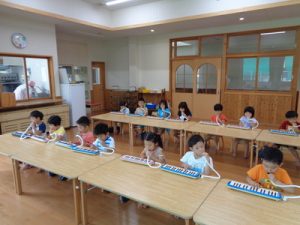 ランチルームで、鍵盤ハーモニカの練習をしました。