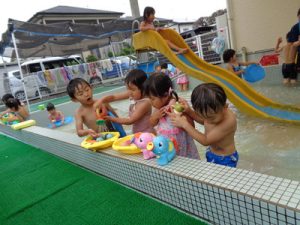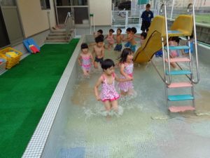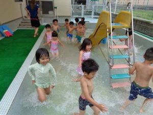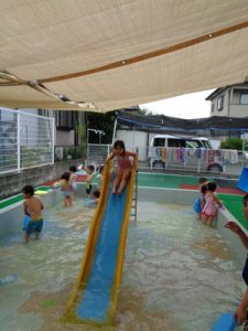 すべり台が怖くて滑れなかった子も挑戦したりと、プール遊びを通して
