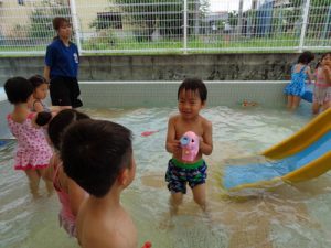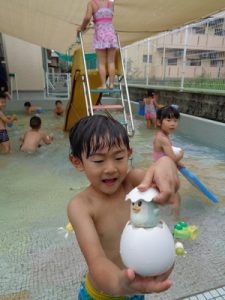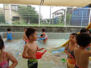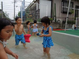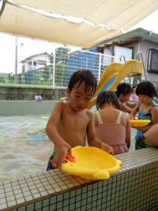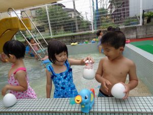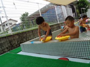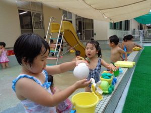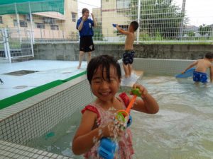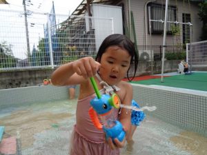 最後は、新しい玩具を出し、保育者やお友達と水の掛け合いっこをして楽しみました。