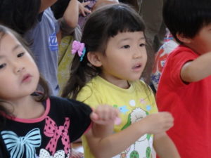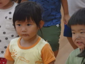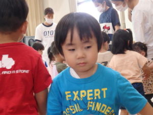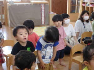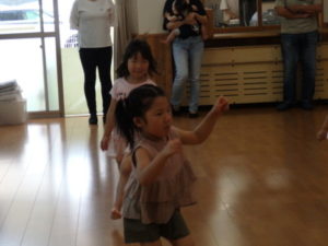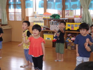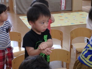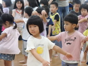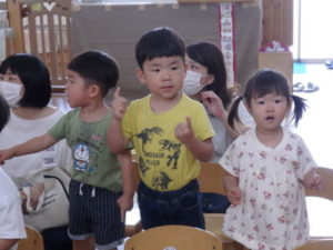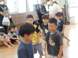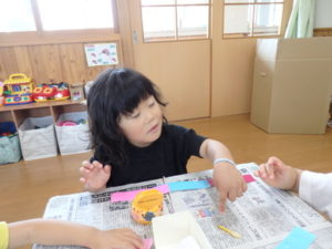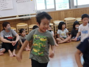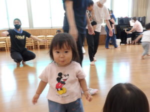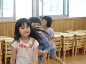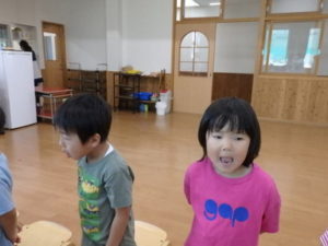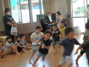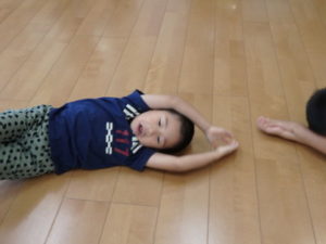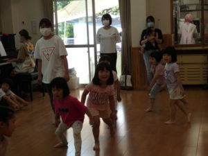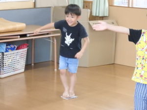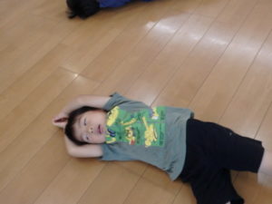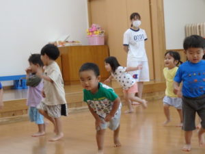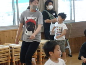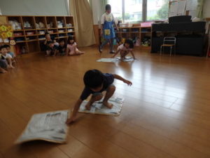 みんな楽しそうに動いていました。その後、部屋で、新聞紙遊びをしました。ジャンケンして負けたら段々新聞紙が小さくなっていって
