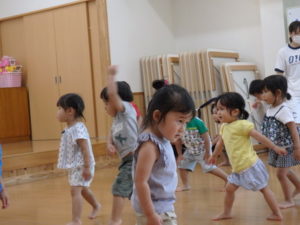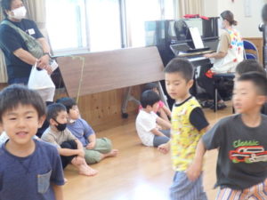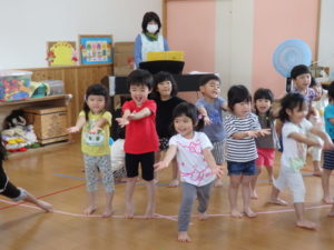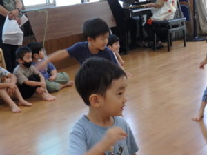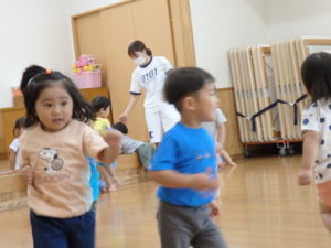 くま組は体操後、きりん組と一緒にリトミックをしました。