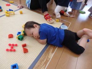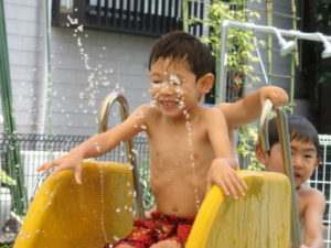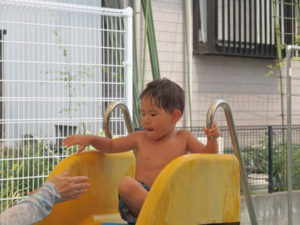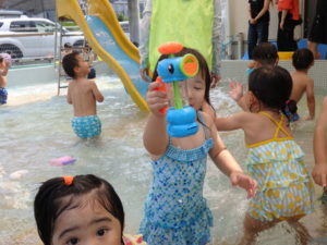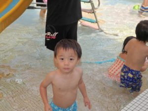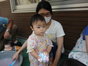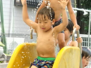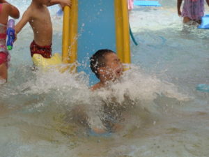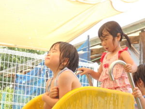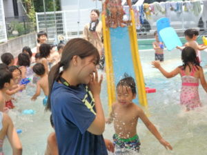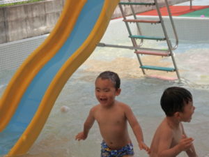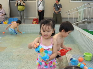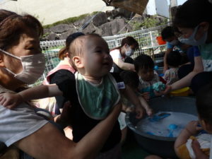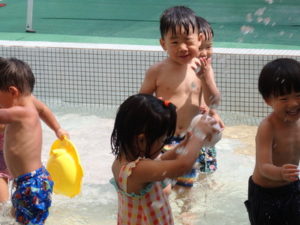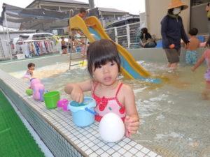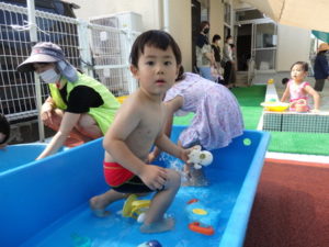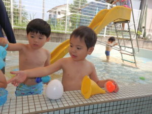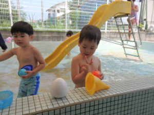 朝の体操を遊戯室で幼児クラスと一緒にした後、プール遊びをしました。滑り台ですべったり、おもちゃ遊びをしたり、