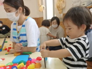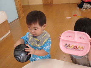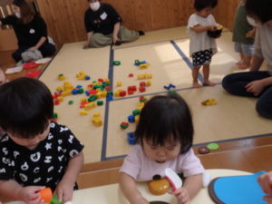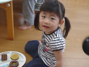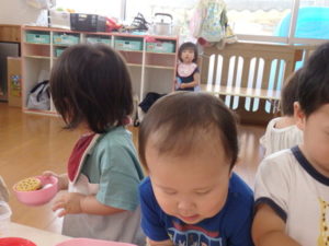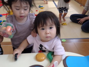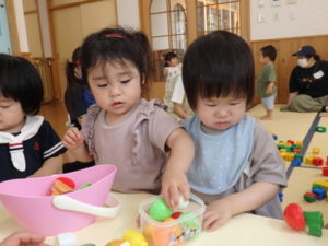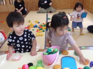 りす組は朝からおもちゃ遊びをしました。ままごと遊びで、お母さんや保育士の先生に食べさせたりするのを