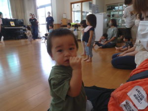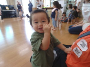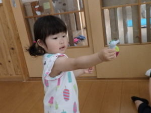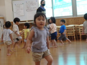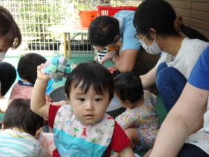 バシャバシャ思いっきりはじけていました。その後、りす組さんと一緒にリトミックをしました。