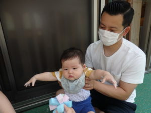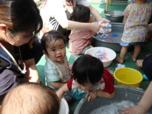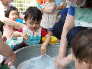 ひよこ組は、テラスに出てスポンジボールを使っての泡遊びをしました。