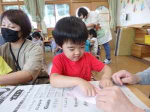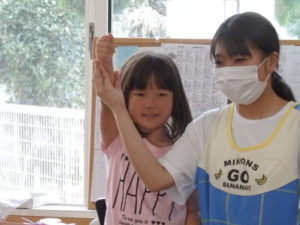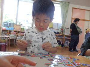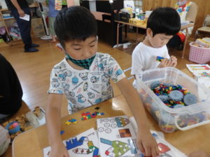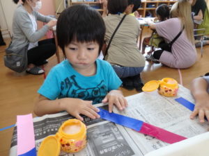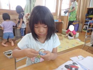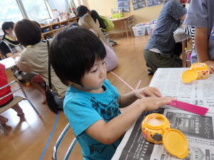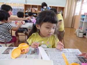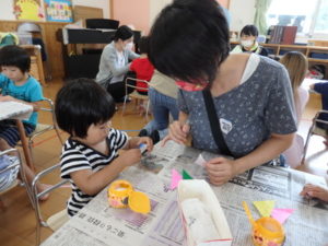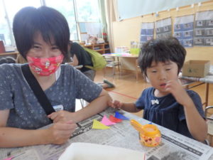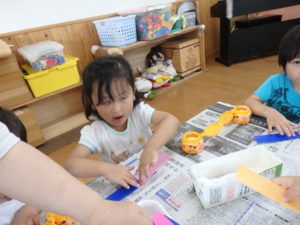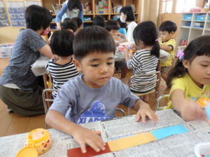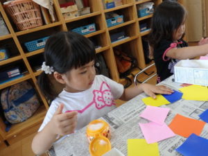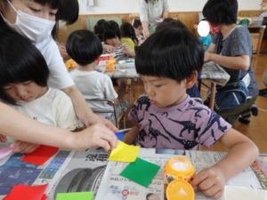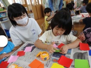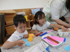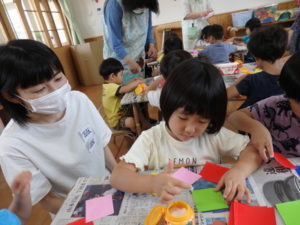 その後、部屋で七夕の飾り作りで、糊を使ったり、折り紙を折ったりしました。
