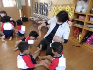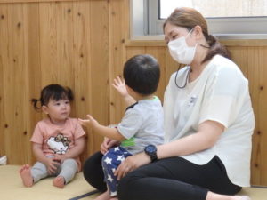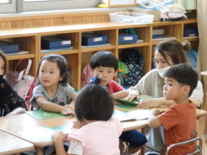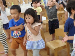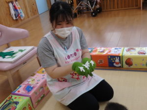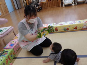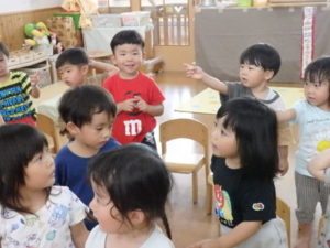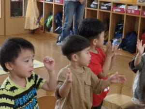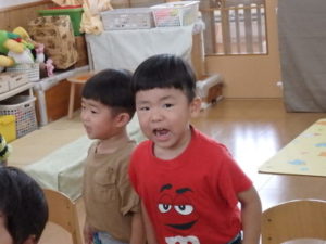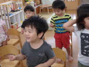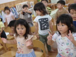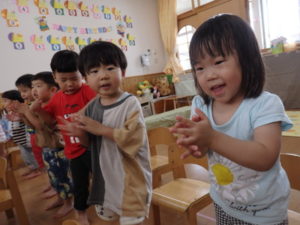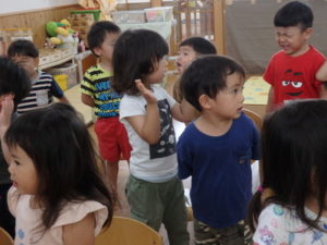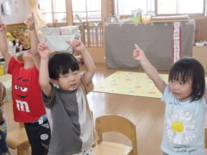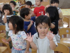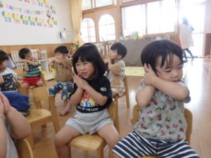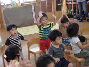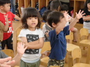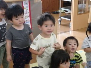 ひよこ組は、お集まりで、はらぺこあおむしの手遊びをして遊びました。