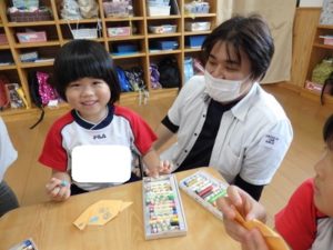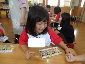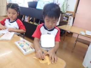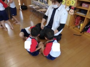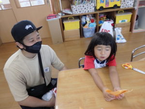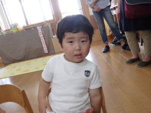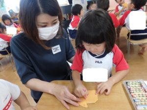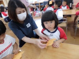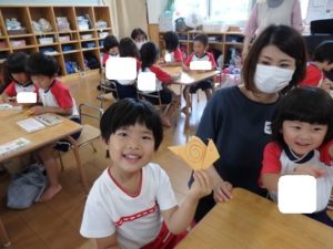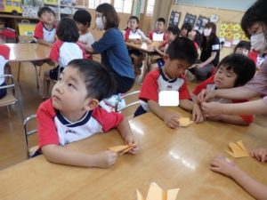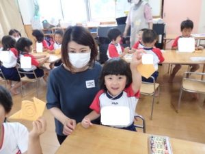 くま組は、体操後かけっこをして、部屋に入りかたつむりの折り紙をしました。