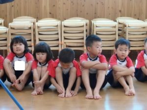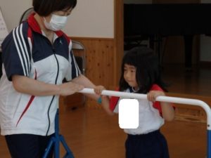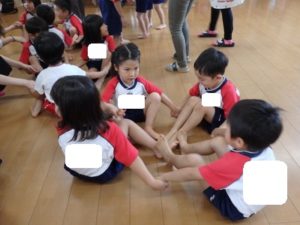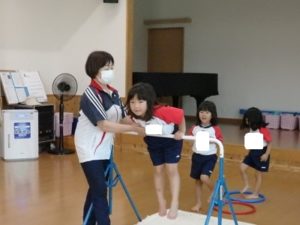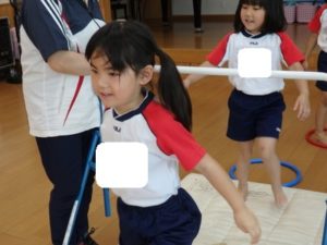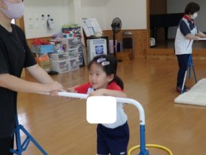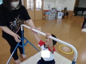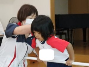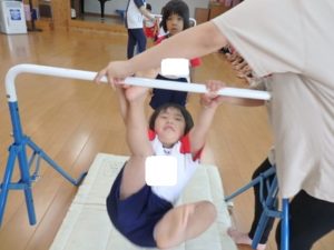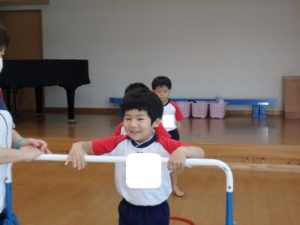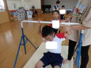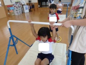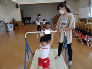 きりん組は、外で体操した後、ランチルームに移動し、体操教室で鉄棒をしました。