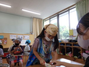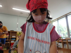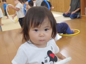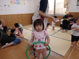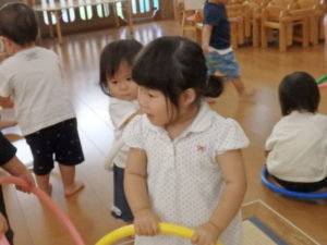 りす組はフープ遊びや、プール遊びをして遊びました。プールでの水遊びも段々慣れてきました。
