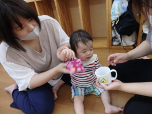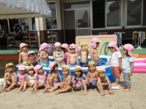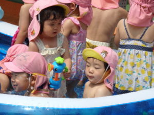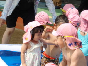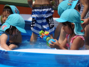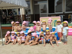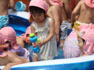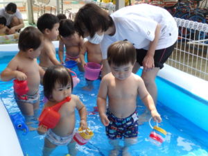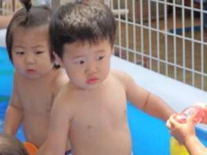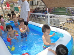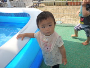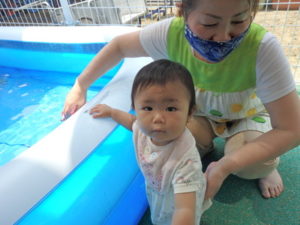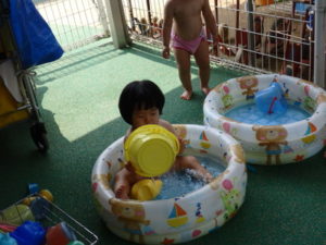 部屋で、お集まりをした後、水着に着替えてミニプールを使って水遊びをしました。