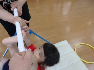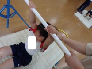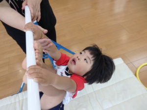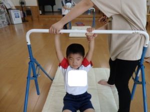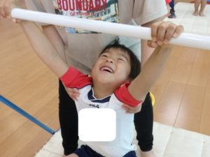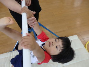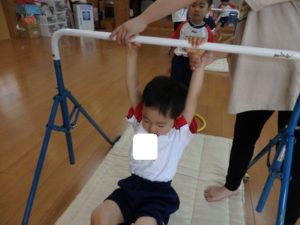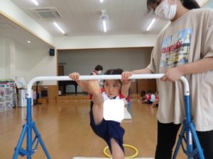 体操教室でした。鉄棒にぶら下がったり、足を掛けて回ったりしました。