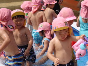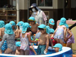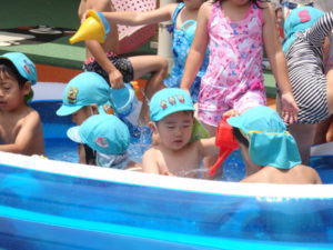 いつものプールと違ってみんなでギューギューになりながら楽しみました。