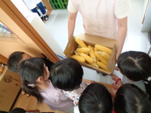 沢山皮をむいて、今日のおやつのトウモロコシを給食室に渡しに行きました。