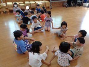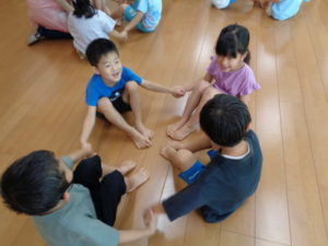 9文字なので、9人のお友達と手をつなぎ座りますが、なかなか9人のグループが出来ず・・・
