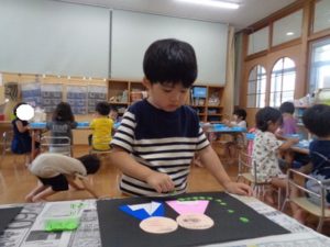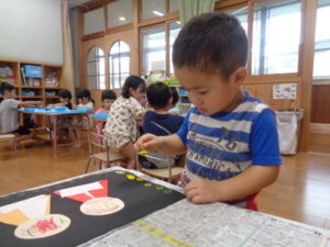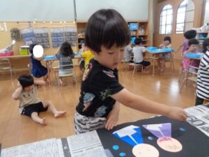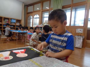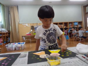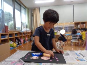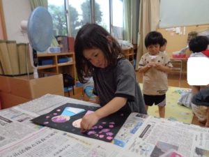 今日は、体操教室後みんなで植えたオクラを使ってスタンプ遊びを行いました。