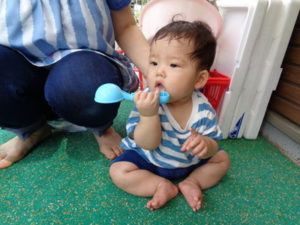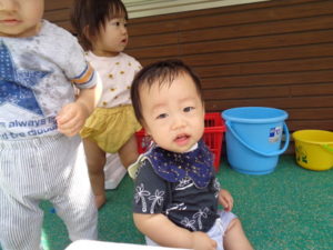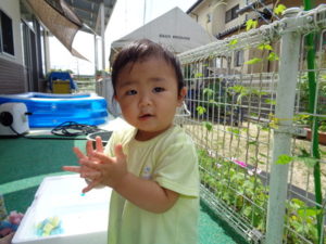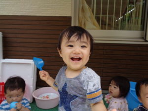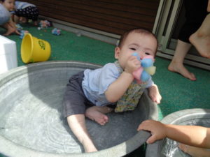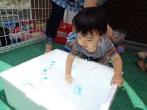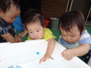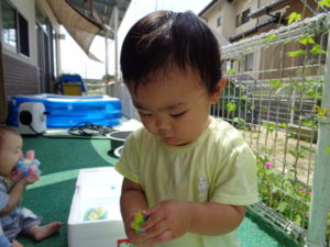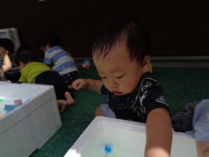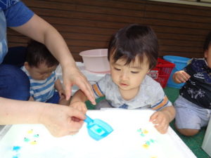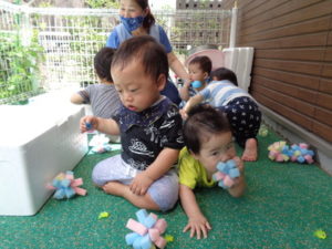 ひよこ組さんは、テラスに出て”金魚すくい”をして遊びました。