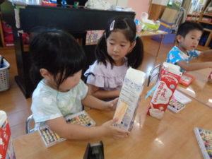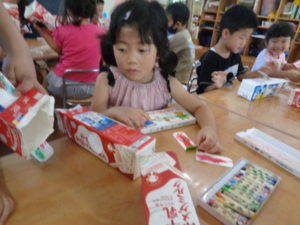 製作コーナーでは、牛乳パックを使ったワンワンジョーロで、耳を付け口の所から水が出るように穴をほがしてもらって牛乳パックにくっつけたら
