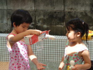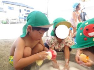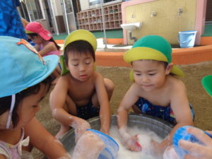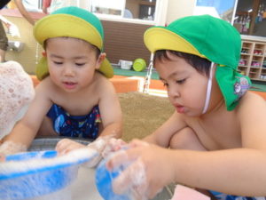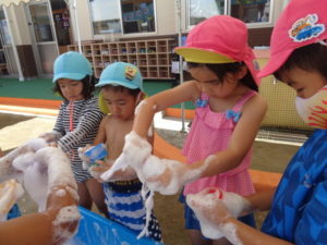 テントの下では泡を使って遊びました。触感も気持ち良さそうで、楽しんでいました。
