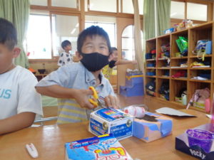 朝、保育園に来て荷物の整理が終わった子から、廃材遊びを楽しみました。