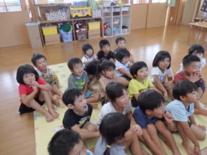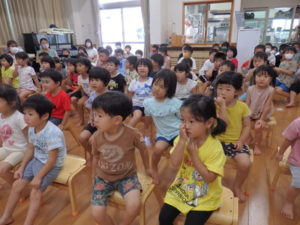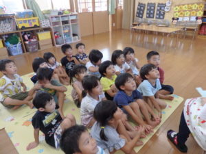 今日は、きりん組からひよこ組までランチルームに集まって、先日来園してくれた、6年生のDVDを
