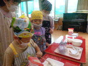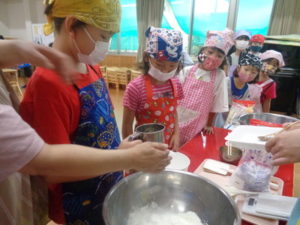 前もって5つのグループに分けて、それぞれのグループごとに材料を量り、卵🥚を割り生地作りをしました。