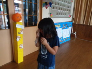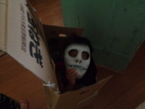を持って来て、始まると同時に着て、色んな所に隠れて、入って来る保育園児を驚かそうとしていました。