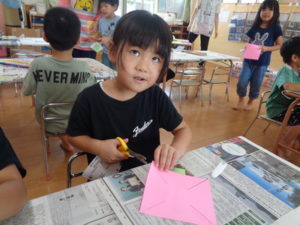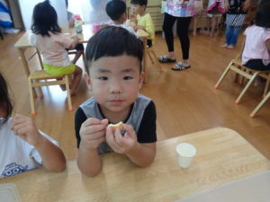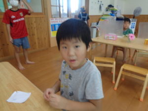 ぱんだ組では、製作のコーナーが設けてあり、ブンブン駒と、風車作りをしました。