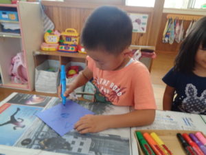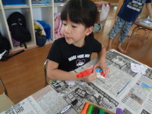 マジックで色んな絵を描いて、自分だけの風車と、ブンブン駒が出来ました。