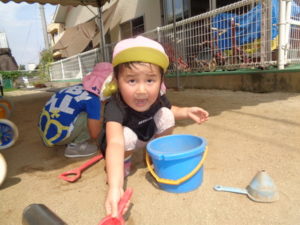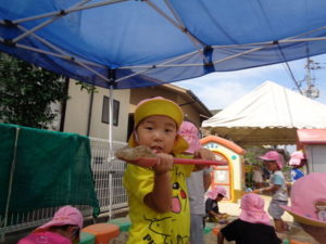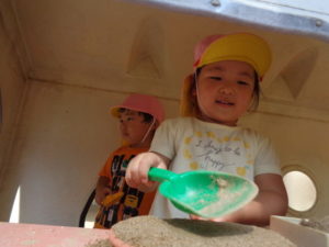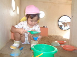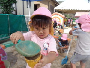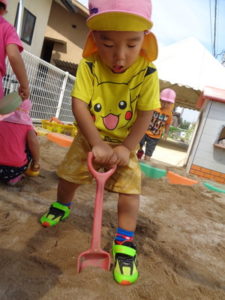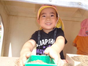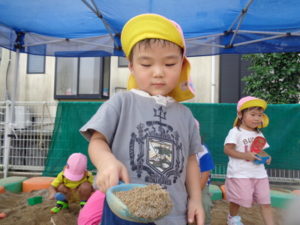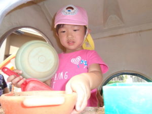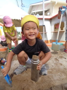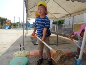 また今日は、いつもより涼しかったので、テントの下で砂場遊びを楽しんでいます。