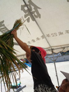 「鎌が動かない・・・」と稲刈りの大変さを実感しながら