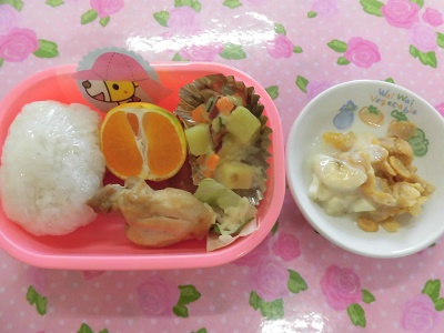 給食は、お弁当箱に詰めました。