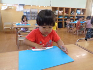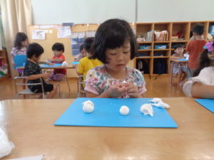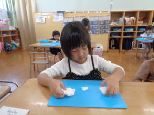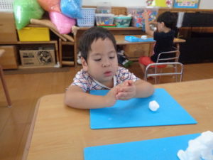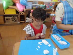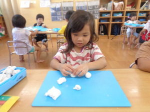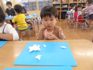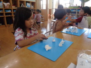 4日(月)から、紙粘土を丸めたり、こねたり、伸ばしたり等しながら