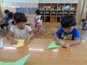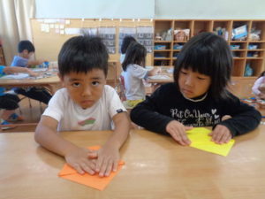 色画用紙を折っていくのは、ちょっと苦戦する子も見られましたが、上手に入れ物が出来