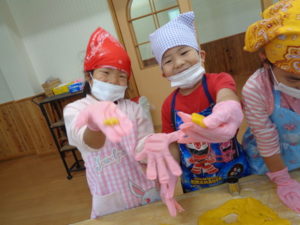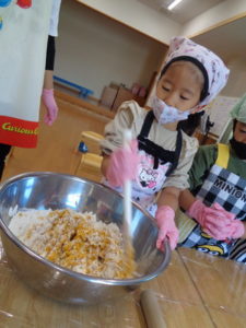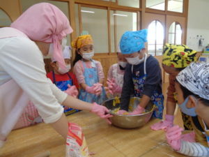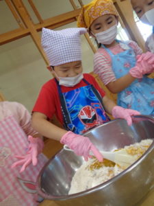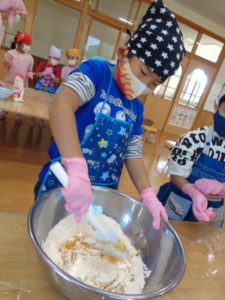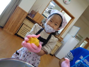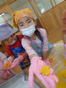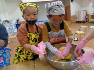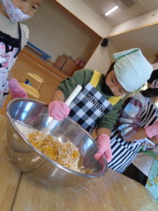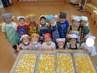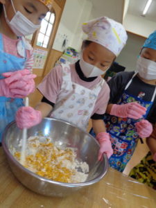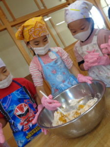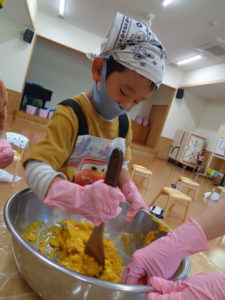 今日のおやつ”カボチャクッキー🎃”を、きりん組🦒さんが給食の先生と一緒に作りました。