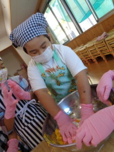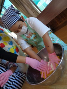 かぼちゃ🎃をペースト状にしたものと、小麦粉を混ぜる作業をしました。