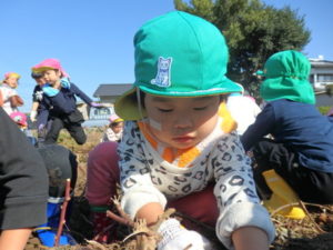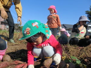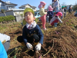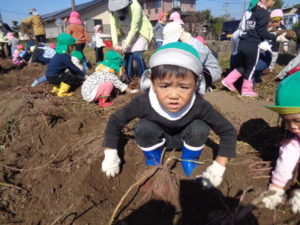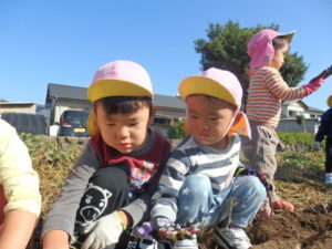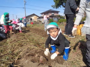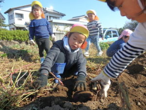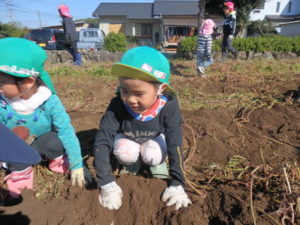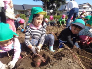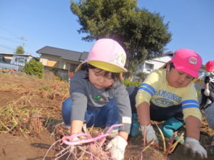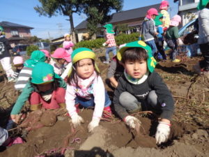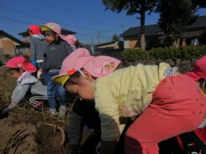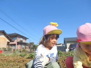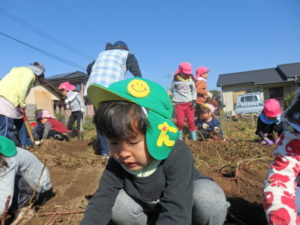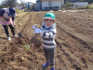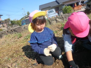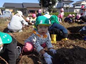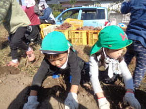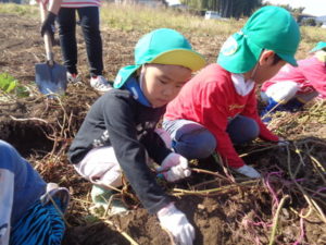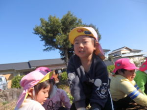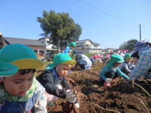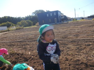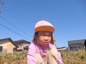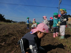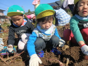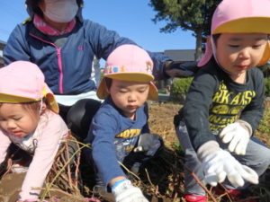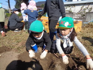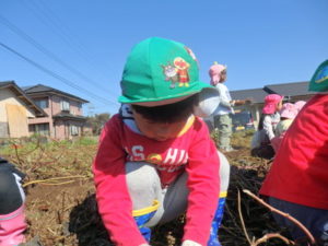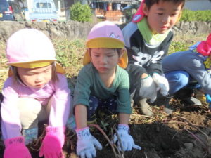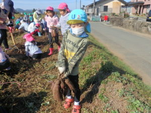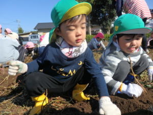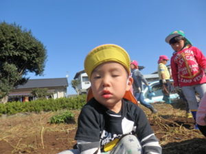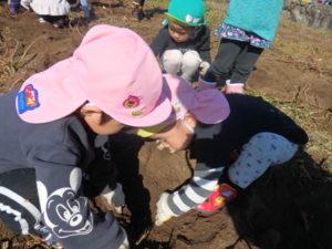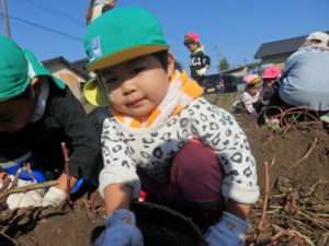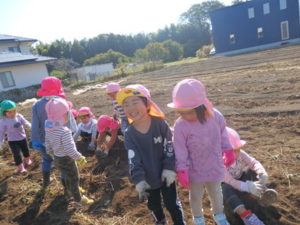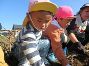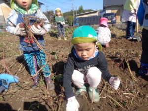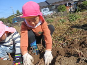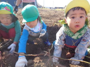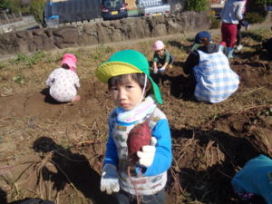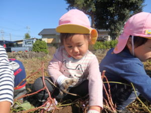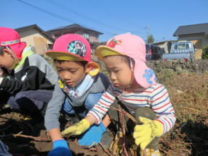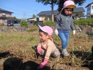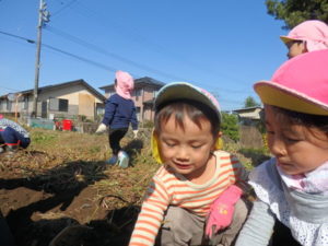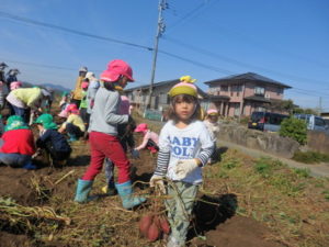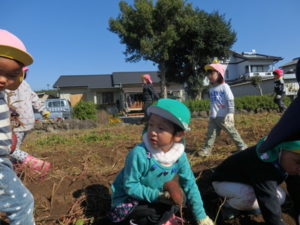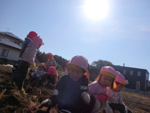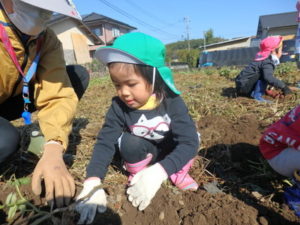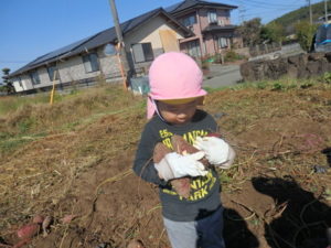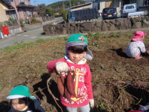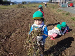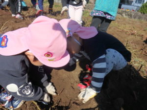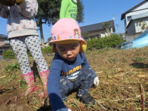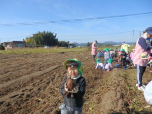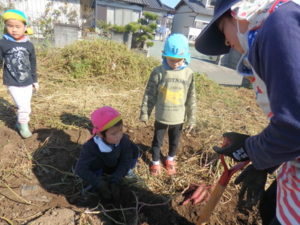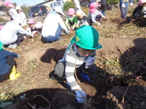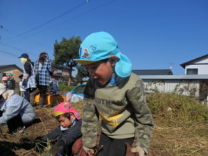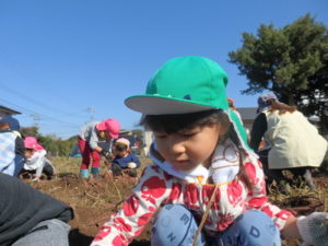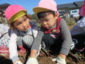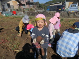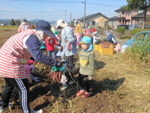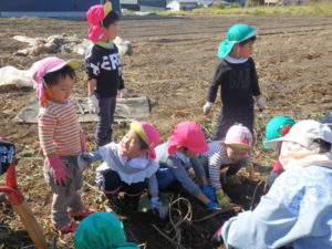 ぱんだ、くま組お手伝いにきりん組が、田島一区の畑へ芋掘りに行きました。