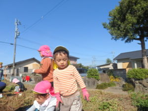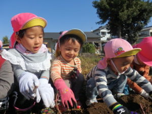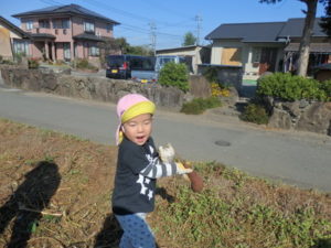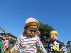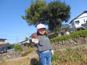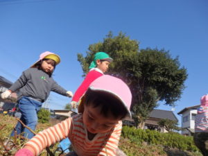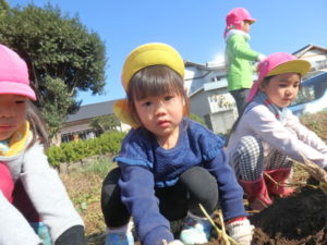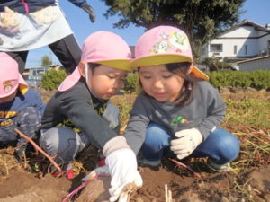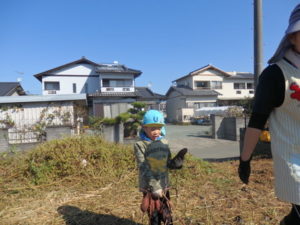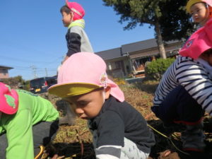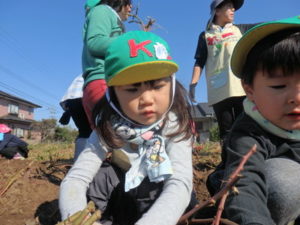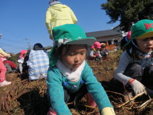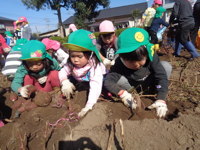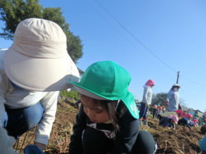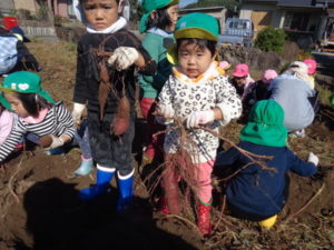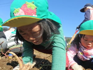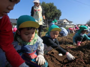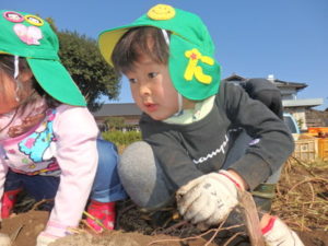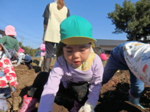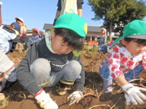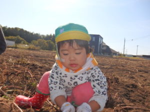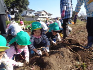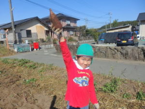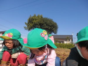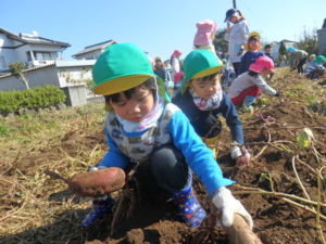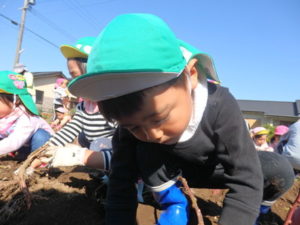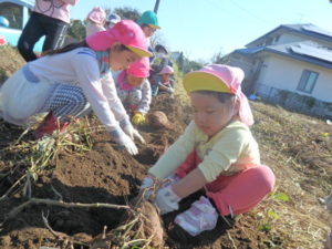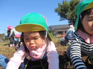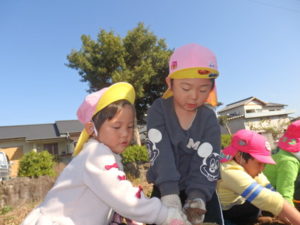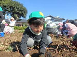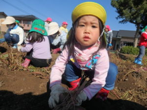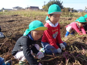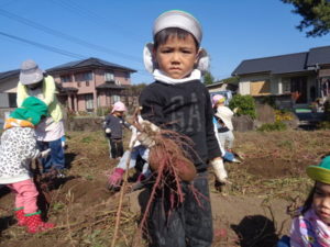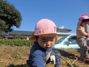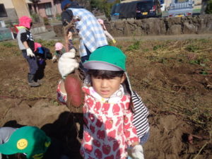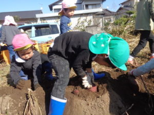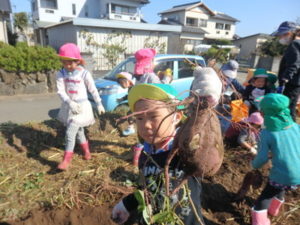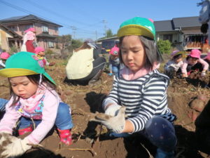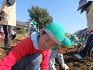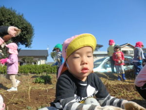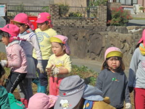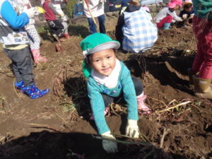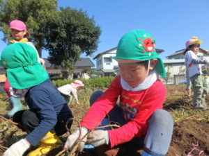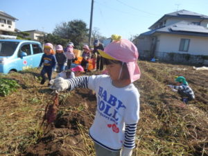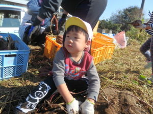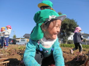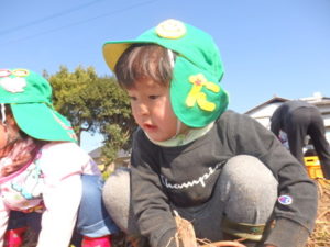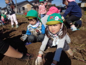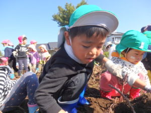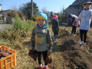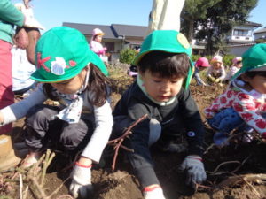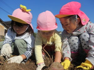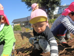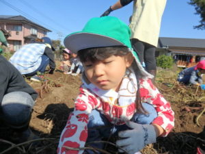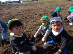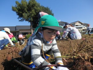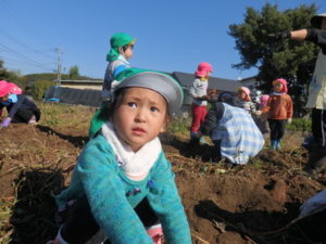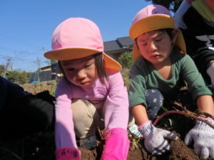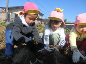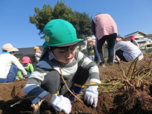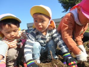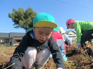 ぱんだ、くま組お手伝いにきりん組が、田島一区の畑へ芋掘りに行きました。