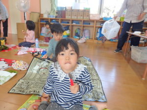 保育園から田島一区の畑までうさぎ組はきりん組に手を引いてもらいしっかり歩きました。