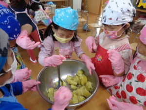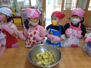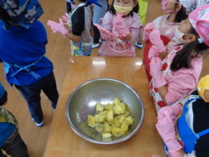 「かたいな~」「甘いにおいがするね❣」「黄色い色のお芋だね」と楽しんでいました✨